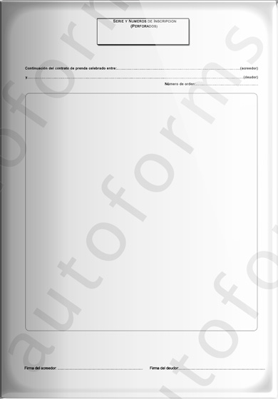 Vale aclarar que a la imagen que está observando se le ha incorporado una MARCA DE AGUA, es decir una leyenda transversal que dice AUTOFORMS. La misma se utiliza para proteger el contrato y hacer valer nuestra propiedad intelectual. Cuando el usuario utiliza nuestro sistema e imprime el contrato prendario, dicha marca desaparece.