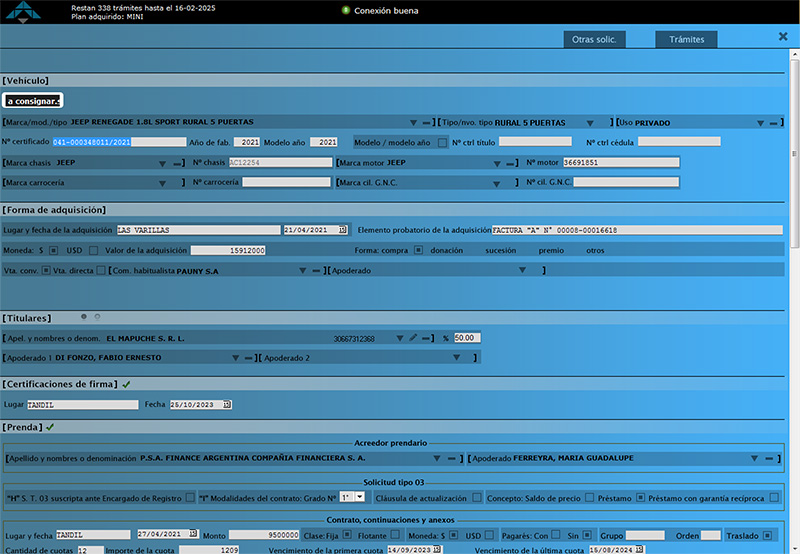 He aquí unos de los paneles principales de Autoforms. En el mismo se selecciona al acreedor prendario, sus apoderados, datos para la S.T. 03, contrato, continuaciones y anexos, como así también todo lo que tiene que ver con las tasas, deudores solidarios, garantes, etc.